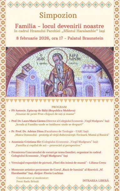 Duminică, 8 februarie, ora 17:00, la Palatul Braunstein, va avea loc simpozionul „Familia – locul devenirii noastre”. Conferințele programate sunt:
